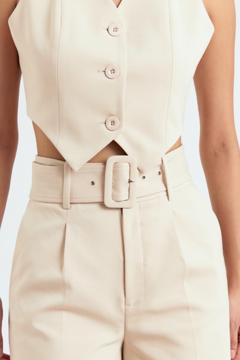 Chaleco confeccionado en sastre de escote pico. Tirantes anchos cruzados en espalda. Forro interior combinado a contraste.